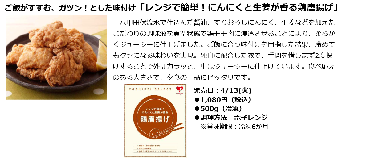 つくる人から笑顔に。をテーマに全国で”食材(ミールキット)宅配サービス”を提供するヨシケイグループの本部、ヨシケイ開発株式会社(本社:静岡市 代表:井野口 雄一)は、全国で毎週約40万部発行する『すまいるごはん』にてヨシケイこだわりプライベートブランド『YOSHIKEI SELECT(ヨシケイセレクト)』を毎週販売中。このたび、新たなラインナップとして、4/12号に「レンジで簡単!にんにくと生姜が香る鶏唐揚げ」、4/19号に「昔ながらのだし香る具付き醤油ラーメン」が登場します。