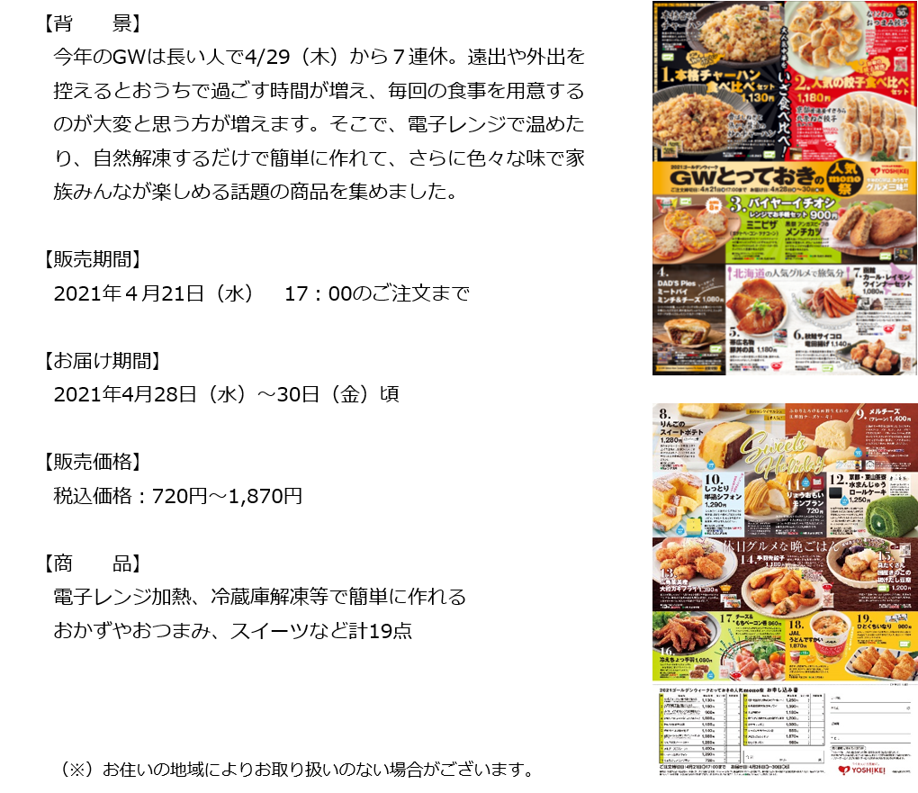 つくる人から笑顔に。をテーマに全国で”食材(ミールキット)宅配サービス”を提供するヨシケイグループ(本部:ヨシケイ開発株式会社/静岡市 代表:井野口 雄一)は、ゴールデンウィーク(GW)に楽しんでいただける「GWとっておきの人気mono祭」企画を実施。人気の冷凍食品や話題のスイーツ等を販売します。![]()