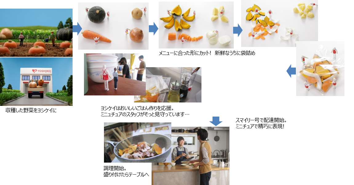 ヨシケイは、1975年の創業以来、食材宅配を通してお客様の食生活をサポートし、北海道から沖縄まで全国約50万世帯のお客様にご利用いただいています。ヨシケイのサービスは、その日に使う分だけの新鮮な食材をミールキットにしてレシピと共にお客様のお手元まで自社便でお届けすること。全国47都道府県にある65のフランチャイズでは、新鮮な野菜を加工して毎日お客様へとお届けしています。今回のCMでは、野菜を収穫、カットして、栄養士の考えたレシピといっしょに食卓に届ける様子をユニークで愛らしいミニチュアの世界の中で表現。映像に出てくるスマイルスタッフやヨシケイロゴの入ったスマイリー号のミニチュア、必見です!
